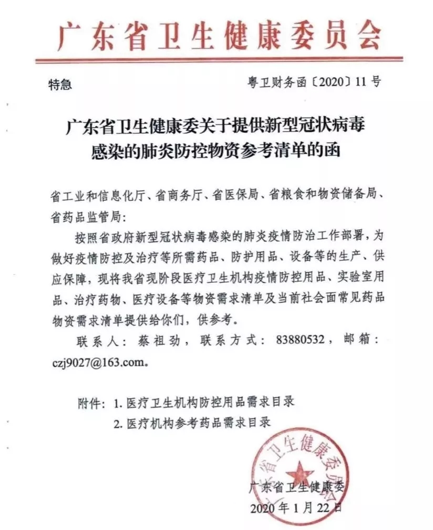 ▲廣東省衛(wèi)生健康委員會(huì)《關(guān)于提供新型冠狀病毒感染的肺炎防控物資參考清單函》